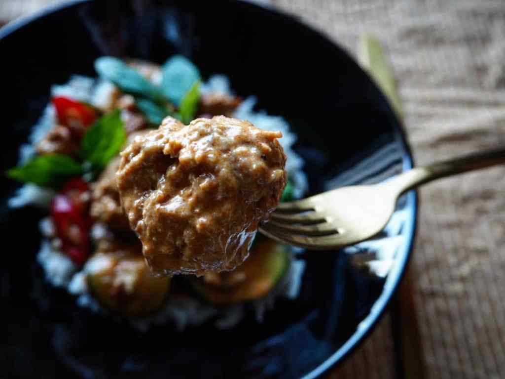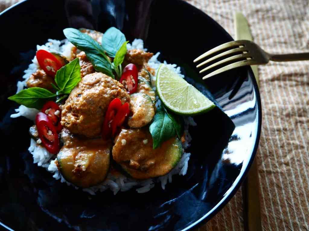 - Sekoita kulhossa jauheliha, pankojauhot, chilihiutaleet, fariinisokeri ja kalakastike. Laita kasari tai suuri pannu kuumentumaan, lorauta öljyä ja pyörittele taikinasta pullat ja lisää pannulle. 2. Kun pullat ruskistuvat, pilko sillä aikaa kesäkurpitsa ohuiksi kiekoiksi ja kuutioi sipuli. 3. Kun lihapullat ovat ruskistuneet molemmilta puolilta, rouhi reilusti mustapippuria, lisää kesäkurpitsa ja sipuli pannulle. 4. Laita kuorittu valkosipuli ja chilit mortteliin tai tehosekoittimeen. Murskaa suht karkeaksi ja lisää pannulle. 5. Lisää currytahna, kuullota hetken aikaa, lisää vesi, kookoskerma, kaffirlimetinlehdet ja kalakastike, laita kansi päälle ja anna kiehua miedolla lämmöllä 15 minuuttia. 6. Lisää lopuksi puolikkaan limen mehu ja ota pata pois hellalta, että limen maku ei haihdu. 7. Tarjoile annos riisin kanssa, revi annoksen päälle thai-basilikaa tai korianteria, pilko chiliä ja purista limen mehua.
