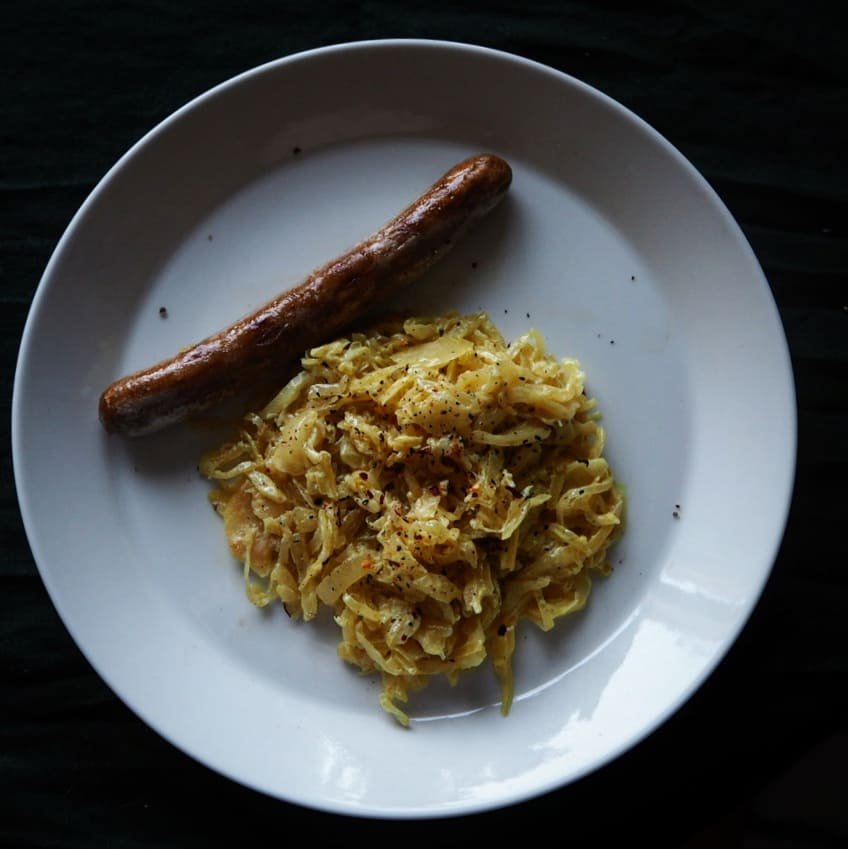 Poikkesin vegemessuilla Kaapelitehtaalla viime viikon lauantaina ja ostin purkin Nordkraut -hapankaalia. Maistettuani kurkumalla ja mustapippurilla maustettua hapankaalia rakastuin, ostin purkin ja nyt vasta ehdin loihtimaan siitä huippuillallisen! Viikkoni ovat täynnä menemisiä ja asioilla juoksemista, joten kyllä, minun mielestäni lasipurkillinen hapankaalia on huippuillallista ja tämän viikon ehdoton kohokohta. Suuntasin töiden jälkeen lähimpään prismaan ja ostin paketin bratwursteja ja purkin smetanaa, mikä ihana pikainen kauppareissu. Kotiin päästyäni ainoa ”vaiva” mitä näin tämän ruoan eteen, oli sipulin pilkkominen. Jaan nyt teille helpon ja mahtavan hapankaalireseptin, tämän määrän voit nauttia yksin tai jakaa kaverin kanssa.
