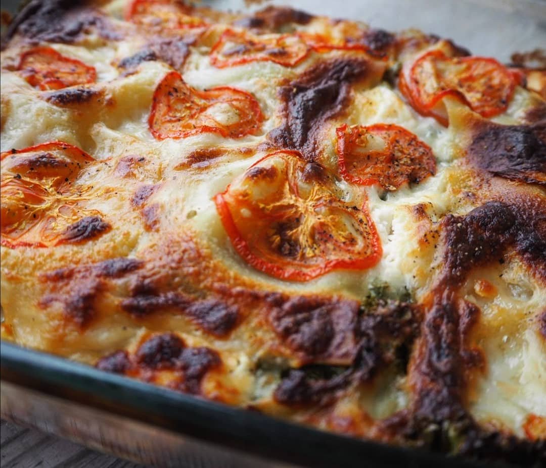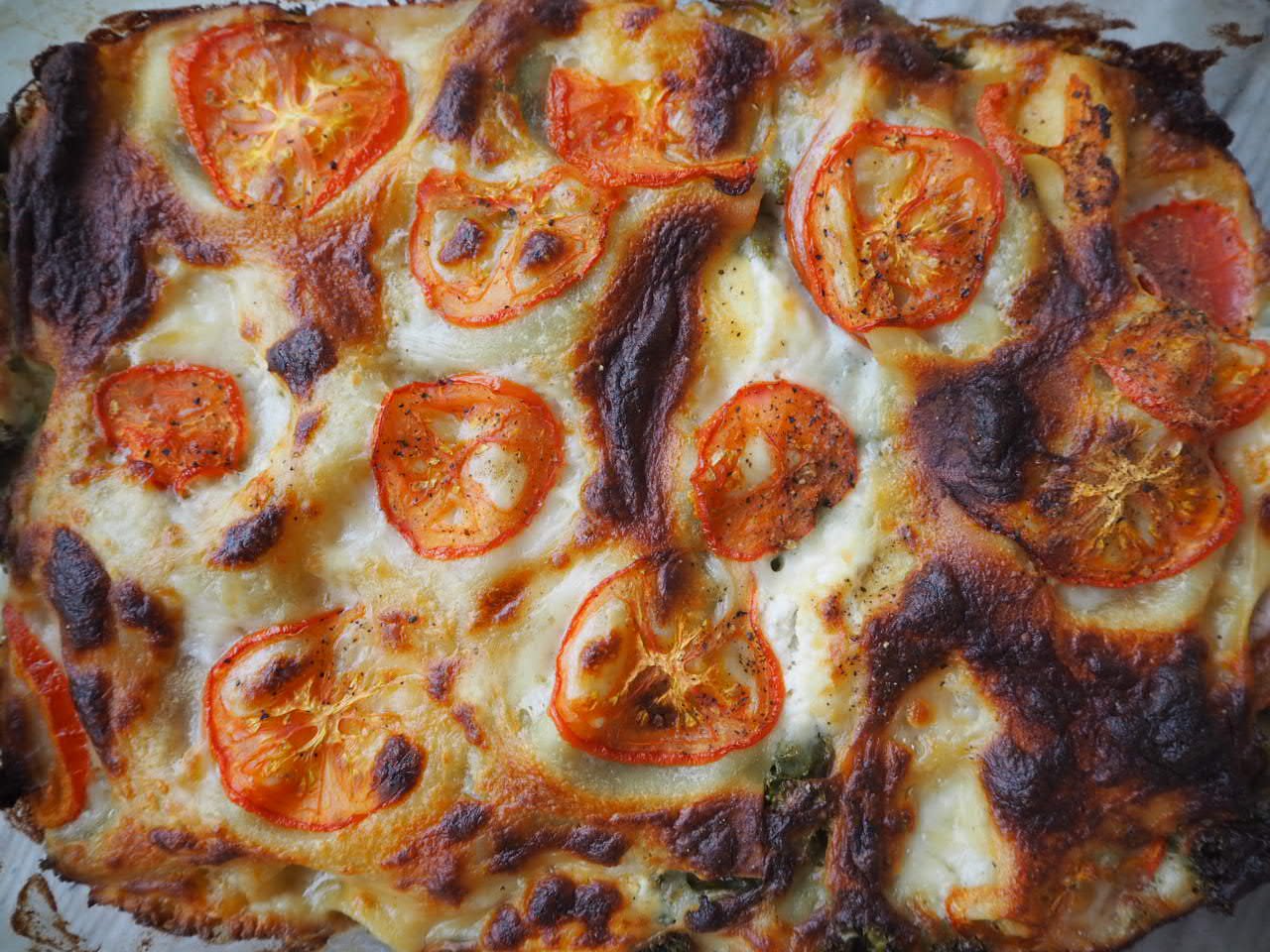 - Levitä päälle kerros lehtikaali-sipuliseosta, tomaattikiekkoja, vuohenjuustoa ja valkokastiketta. Tee samanlainen kerros päälle.