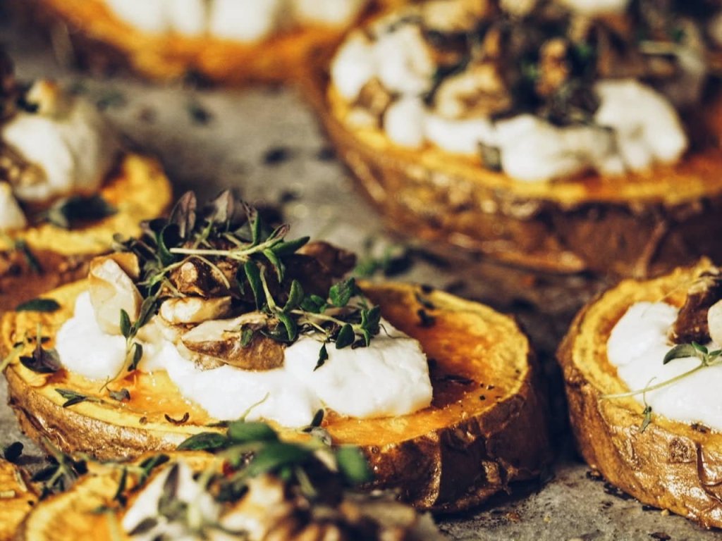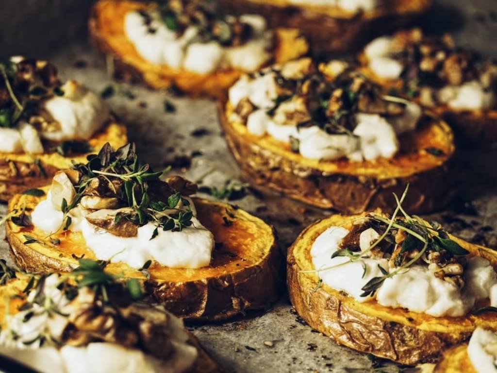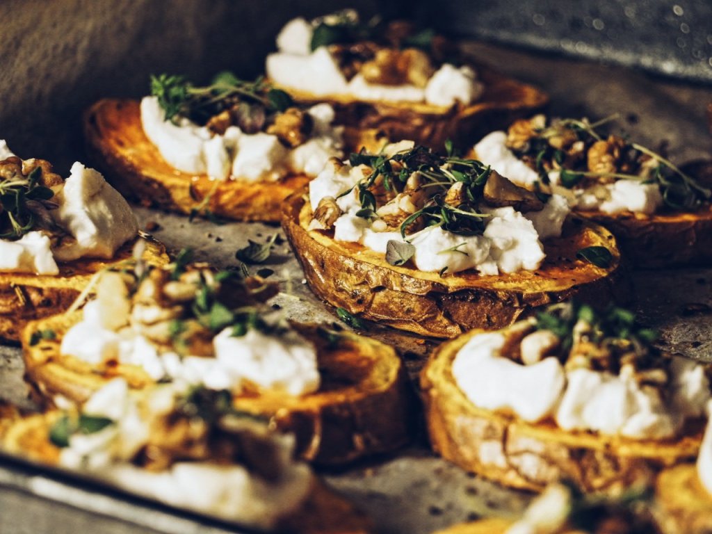 - Paahda uunissa 20 minuuttia, nosta pelti pois uunista ja lisää bataattien päälle vuohenjuusto, rouhittuja pähkinöitä ja timjamia. Paahda vielä 10 minuuttia.