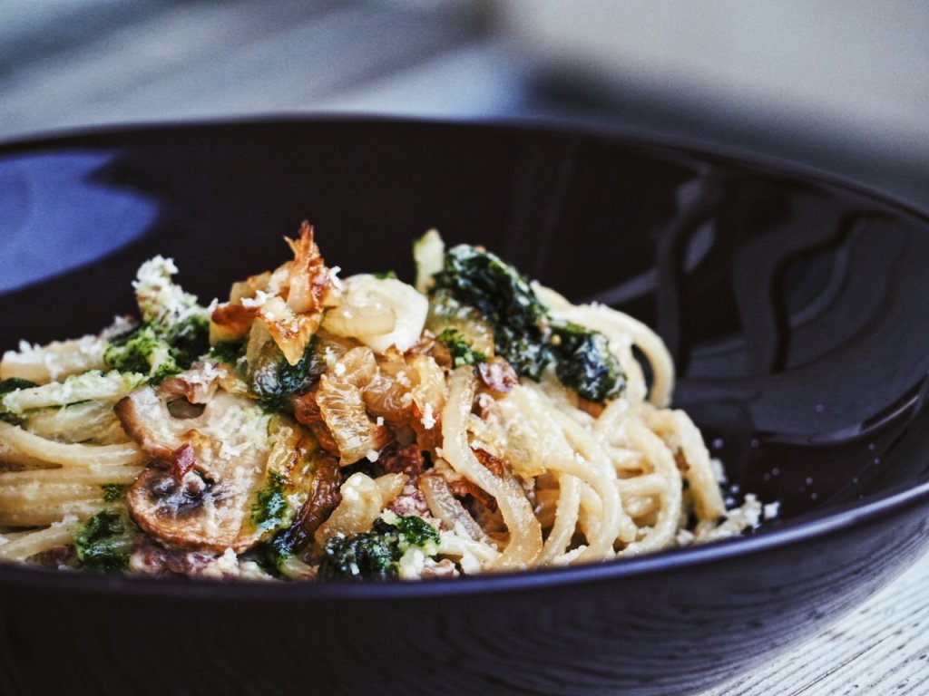 Tämä pasta ei synny aivan hetkessä, mutta ei tässä tuntia pidempään mene. Sipulit karamellisoidaan ihanan tahmeiksi ja makeiksi, missä menee noin puoli tuntia. Makea sipuli ja suolainen pekoni ovat täydellisiä yhdessä. Lehtikaali ja yrttiöljy tuovat kauniin vihreän värin ja herkkusienet ovat sopiva lisä tähän annokseen.