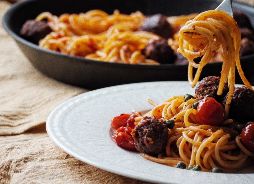Tomaattinen spagetti kasvispyöryköillä, 3 annosta