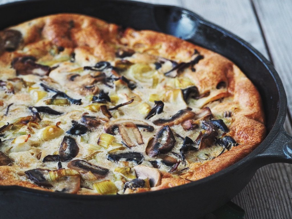 Tämä on blogini kolmas pannariohje. Lehtikaalipannari oli hitti ja sienipannari ylsi helposti samalle tasolle. Paremman puoliskon kaapeista löytyy melkein ympäri vuoden ihania kuivattuja sieniä. Suurimman osan olemme käyttäneet ja tänään käytimme loput kuivatut mustatorvisienet sienipannariin, nam nam nam! Mustatorvisienien lisäksi lisäsin pannariin herkkusieniä ja purjoa. Suolainen pannukakku on nopeaa, herkullista ja edullista ruokaa. Jos sinulta löytyy pienikin määrä kaapista kuivattuja sieniä, tämä on oiva tapa hyödyntää ne.