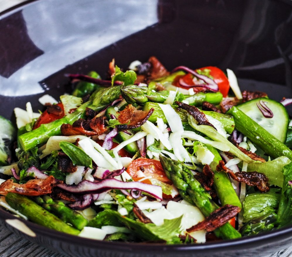 - Annostele salaatti lautasille, lisää päälle reilusti parsaa, pekonia ja vuole päälle parmesaanilastuja.