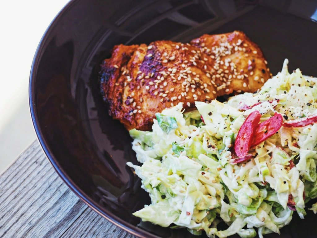 Asettele broilerit lautasille, lisää reilusti kaalisalaattia ja ripottele päälle seesaminsiemeniä. Tätä ruokaa ei voi vastustaa ❤