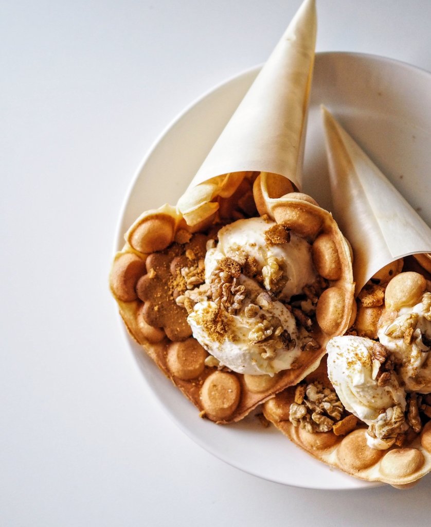 Täytin makeat vohvelit vaniljajäätelöllä, piparkakkumurulla ja kermavaahdolla. Viimeistelin annokset saksanpähkinöillä ja vaahterasiirapilla ❤
