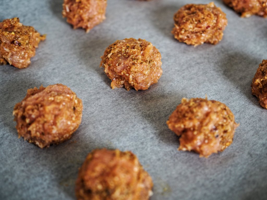 - Lisää kananjauheliha, seesaminsiemenet ja mausteet, sekoita taikina huolellisesti käsin.