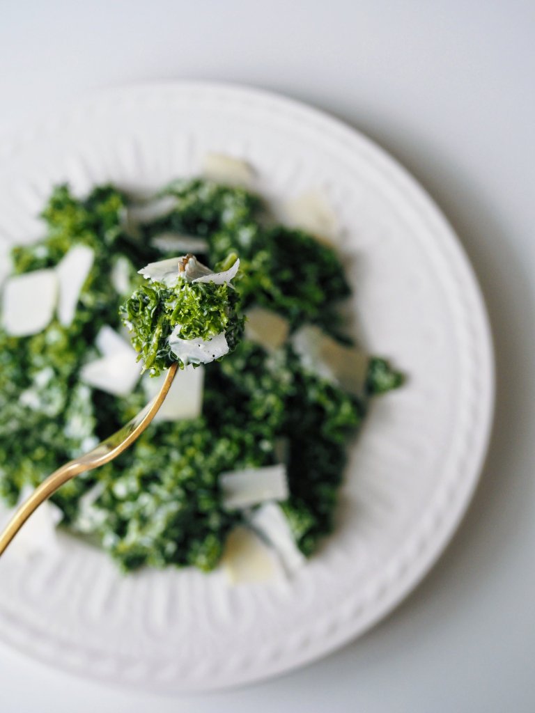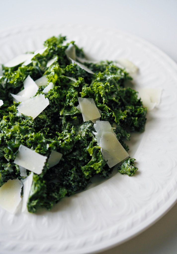 - Sekoita kastike lehtikaalin kanssa ja asettele tarjoiluastiaan, vuole päälle parmesaanilastuja.