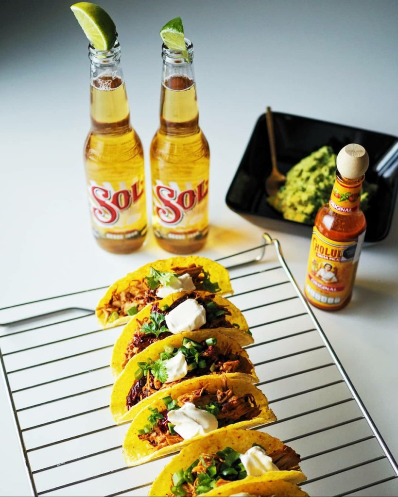- Täytä tacot ja lisää ranskankermaa, guacamolea, kevätsipulia, korianteria, jalapenoa ja chilikastiketta halutessasi.