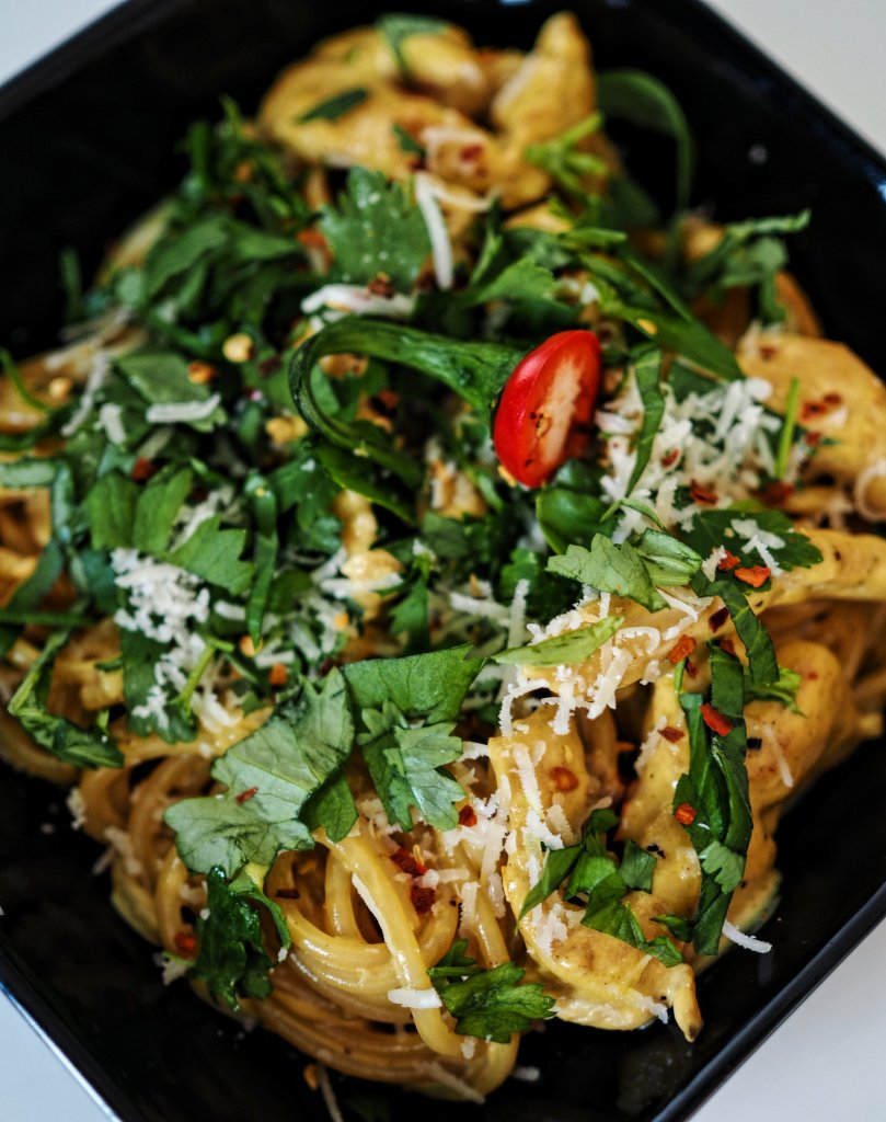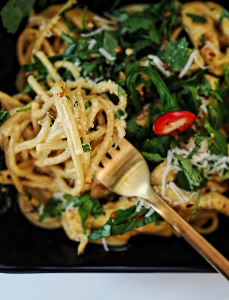 Tänään pastasta tuli mausteinen, kermainen ja kokonaisuuden kruunasi tuoreet yritit. 20 minuuttia ja ruoka on valmista! Tämä resepti sopii FODMAP-ruokavaliota noudattaville.