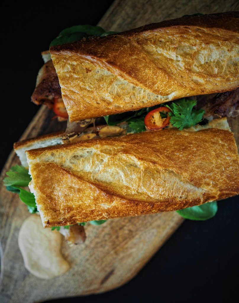 Patonkien välistä löytyy kimchiä, mutta halusin valmistaa siitä myös majoneesin tuomaan extramakua, ja siitä tuli aivan loistavaa. Lisäksi patongeissa on raikkaita kasviksia ja rapeaksi paistettuja possun kylkiviipaleita.