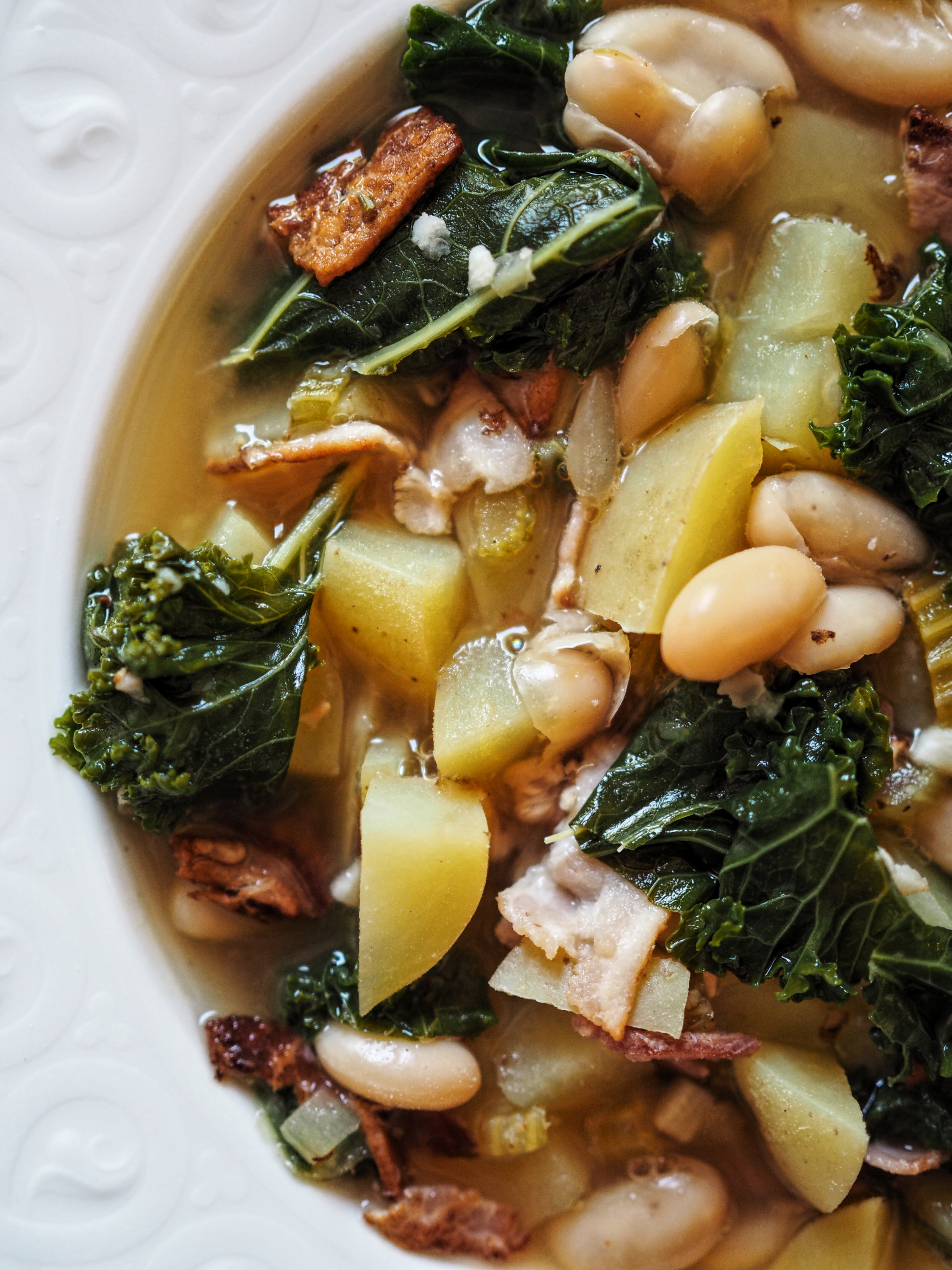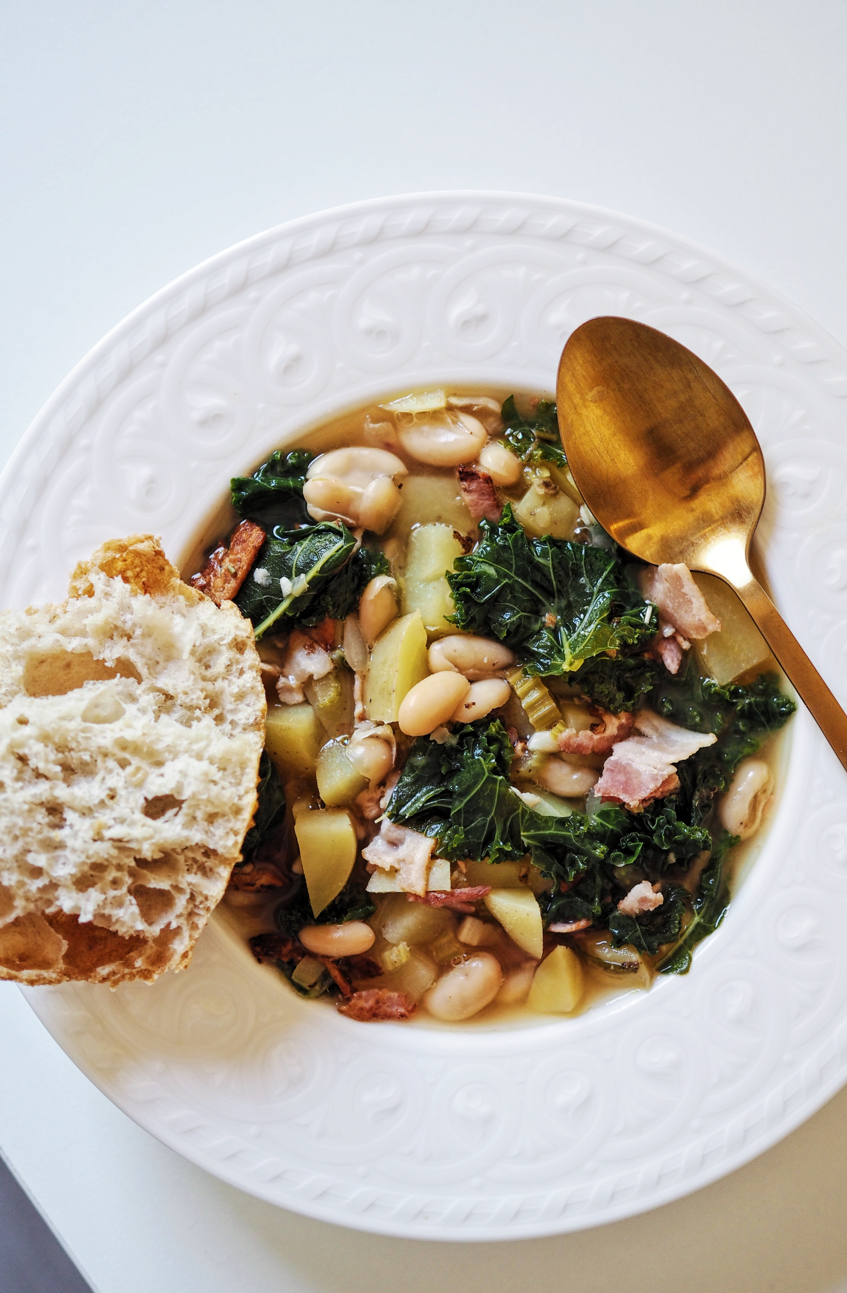 Kyllä se on nyt myönnettävä, että syksy kolkuttaa oven takana. Aika kaivaa padat kaapista ja valmistaa herkullisia pataruokia ja keittoja. Tein tänään sunnuntai-illalliselle todella maukkaan keiton, mikä ei kuitenkaan vaadi paljoa! Cannelinipapuja, lehtikaalia, perunaa ja pekonia. Pekoni antaa suolaa ja rasvaisuutta keittoon, mikä takaa herkullisen maun. Tallenna ohje viileitä syyspäiviä varten valmiiksi!