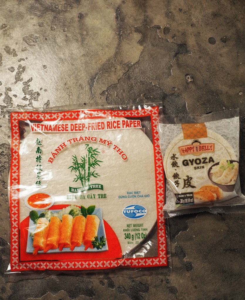 Gluteenittomat dumplingit teimme riisipaperista, mitä voi uppopaistaa. Me paistoimme rullat kuitenkin airfryerissa. Jos haluat tehdä myös airfryerissa nämä, niin osta ihan tavallista riisipaperia. Tämä uppopaistoon tarkoitettu riisipaperi oli mielestäni turhan paksua. Rullista tuli kyllä ihan hyviä, mutta jatkossa ostan tavallista riisipaperia. Miellän itse riisipaperista tehdyt rullat paistettuina kesärullina, mutta tiktok-trendin myötä näitäkin voi kutsua nyt dumplingeiksi. 😀