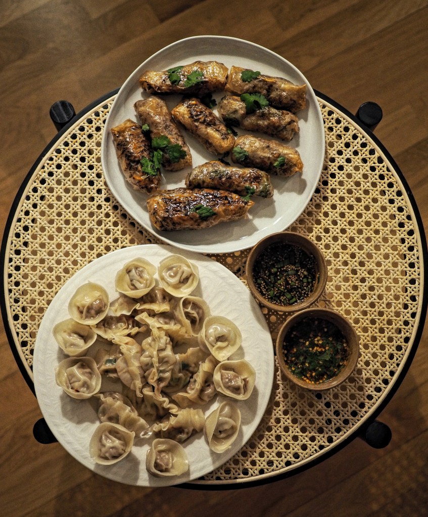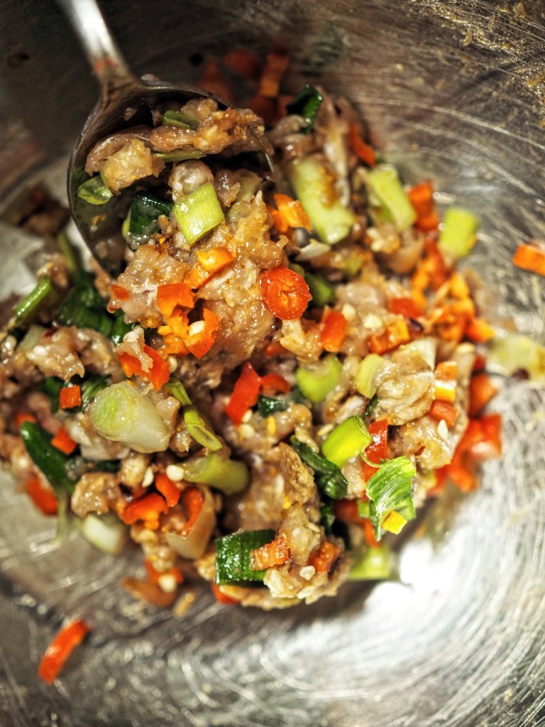 Kana-maapähkinä dumplingien lisäksi teimme chili-kana dumplingeja ja gluteenittomia riisipaperista tehtyjä paistettuja ”dumplingeja” vegaanisesti tofu täytteillä. Teimme siis kaksi erilaista kana- ja tofutäytettä.