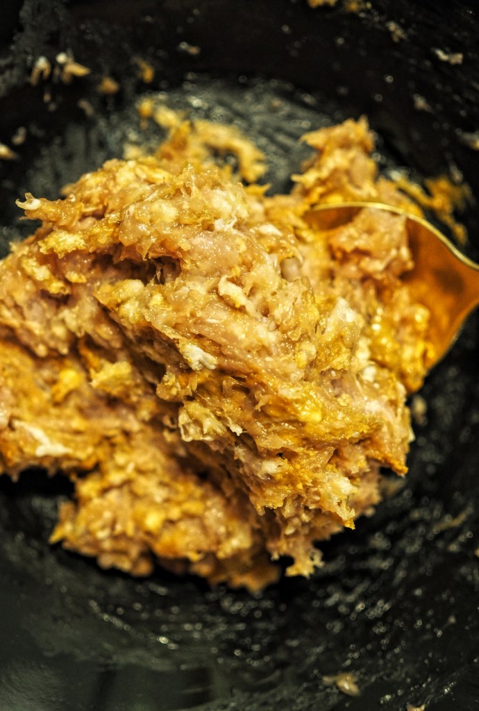 Teimme ensimmäistä kertaa dumplingit kananjauhelihasta ja se osoittautui parhaaksi raaka-aineeksi ehdottomasti täytteen valinnassa. Kanan jauhelihasta saa hyvän rakenteen taikinaan ja se kypsyy niin, että täyte pysyy ilmavana eikä muutu ns. lihapullaksi. Maapähkinävoi toi myös kuohkeutta ja pehmeää makua täytteeseen. Suuri suositus tälle!