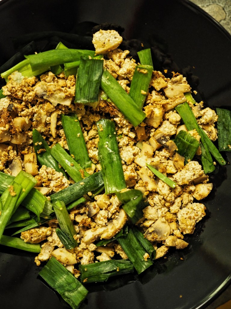 - Hienonna tofujen paistuessa herkkusienet aivan pieneksi silpuksi ja lisää pannulle.