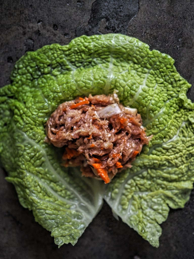 - Nosta täytettä kaalin keskiosaan ja taittele kaalista rullia. Tämä osuus oli helpompaa kuin olisin uskonut! Taittelu ei aiheuttanut sotkua ja täyte pysyi hyvin sisällä. Suosittelen katsomaan youtubesta videon, mikäli et ole aiemmin taitellut kaalikääryleitä.