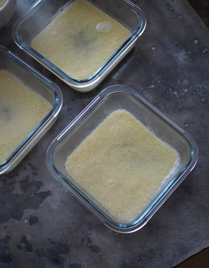 Keitä vettä vedenkeittimellä. Mittaa couscousia syvälle lautaselle, kulhoon tai eväsrasiaan haluamasi verran. Itse annostelin 50 g per astia. Voit lisätä tässä kohtaa mausteita, oliiviöljyä tai vaikka yrttejä mukaan. Yleensä ripottelen joukkoon hieman suolaa, mustapippuria ja kurkumaa, mutta tällä kertaa lisäsin vain hieman suolaa. Maustamisen jälkeen kaadetaan kuumaa vettä couscousin päälle niin, että couscous peittyy. Katso alta kuvasta mihin asti vettä kaadetaan. Anna tekeytyä noin viitisen minuuttia ja sekoita, voit lisätä vettä vielä tarvittaessa.