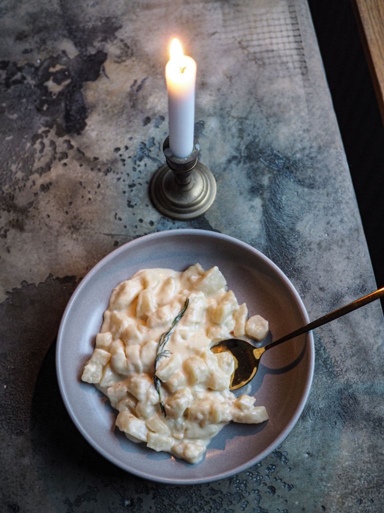 5. Lisää kerma ja anna muhennoksen hautua miedolla lämmöllä välillä sekoittaen, kunnes rakenne on samettisen pehmeä. Lisää joukkoon myös rosmariinin oksa.